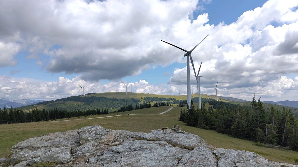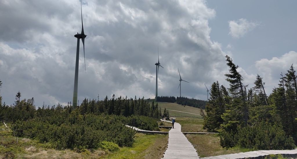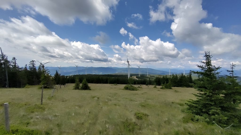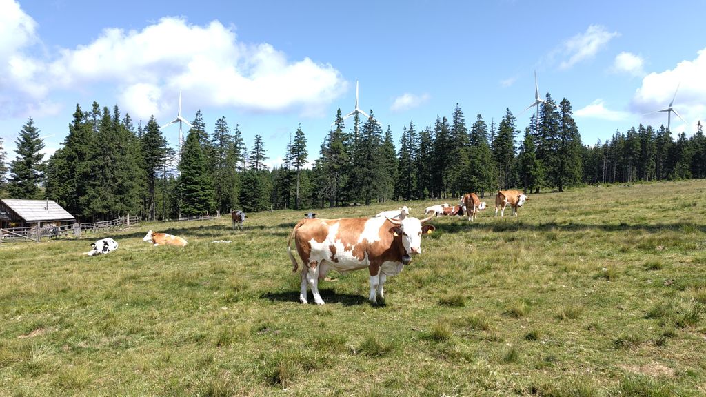 Bald ist das Hauereck (1292 m) erreicht, wo es eine bewirtschaftete Hütte und im Winter ein kleines Skigebiet gibt. Etwas danach kommt der Weg auf ca. 1.400 Metern aus dem Wald heraus, und weiter geht es über Almen, auf denen im Sommer Rinder weiden. Ab hier gibt es auch zahlreiche Windräder, die auf dem gesamten Höhenrücken aufgestellt sind.