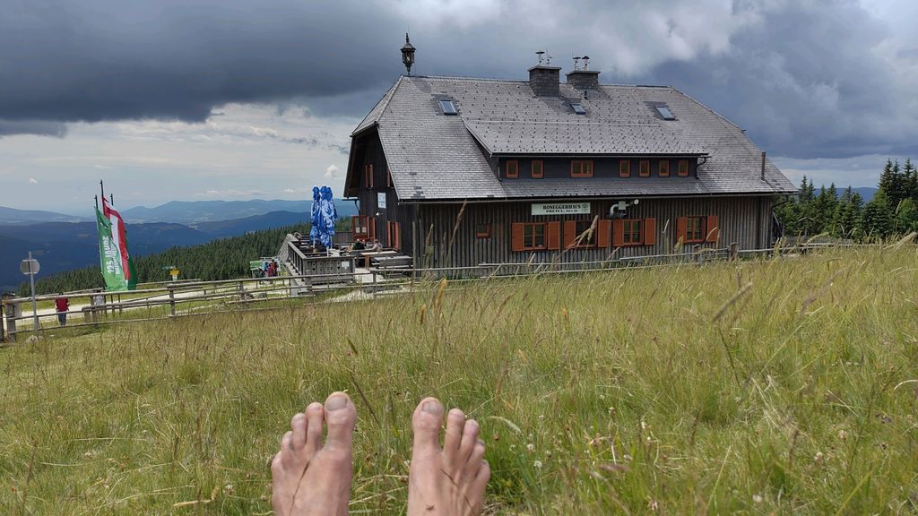 Der Alpannonia- und Zentralalpenweg führt weiter über das Stuhleck (im Winter als Skigebiet bekannt), ich bog aber links ab für den schönsten Abstieg von der Pretul nach Mürzzuschlag, Weg 743 über die Schwarzriegelalm. Dort machte ich Kaffeepause in einer weiteren kleinen gemütlichen Schutzhütte (1460 m) am Waldrand. Der Weg führt nun bergab im Wald, nach dem Regenguss wieder mit etlichen Bächen und Pfützen. Auf 1.070 Metern ist das Bettlbauer-Haus (privat) erreicht und kurz darauf öffnet sich der Blick auf Mürzzuschlag, der Weg verläuft in diesem Bereich wieder leicht bergab großteils auf Wiesen.
