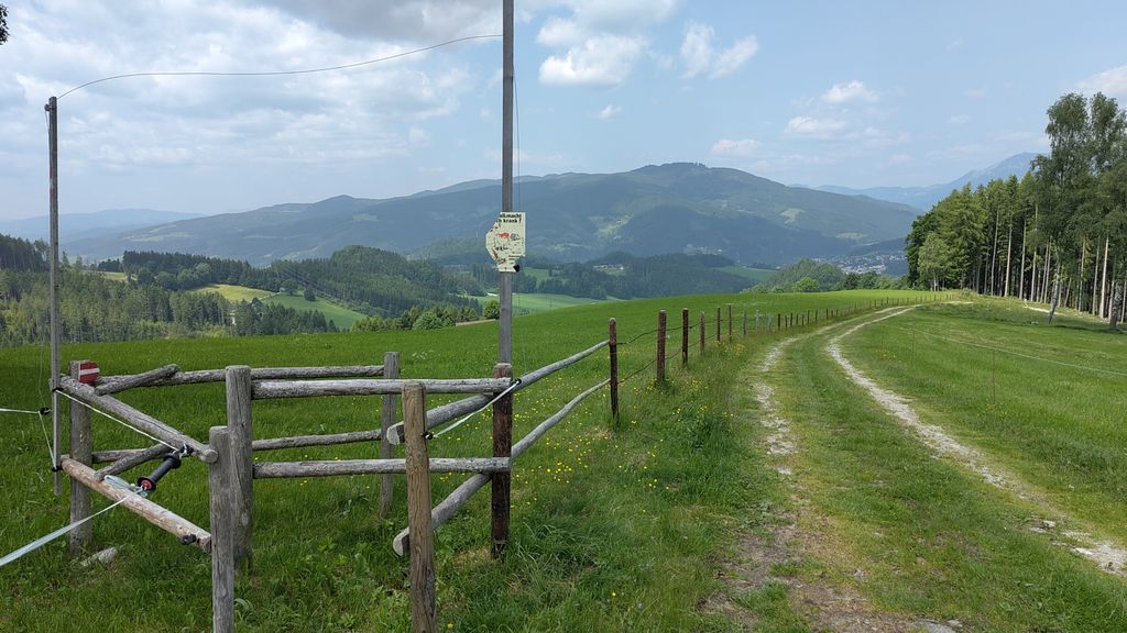 Vom Steinriegel (1577 m) gibt es bei gutem Wetter eine tolle Aussicht auf Hochschwab und Rax. In diesem Bereich musste ich wegen etwas unklarer Wegführung einen Stacheldrahtzaun überqueren, da habe ich wohl einen Überstieg verpasst (der Weg verläuft in der beschriebenen Richtung rechts vom Zaun). In diesem Bereich verläuft der markierte Weg auf wunderbar weichen Almwiesen, trotzdem ist Vorsicht geboten, da mancherorts Stacheldraht am Boden liegt.