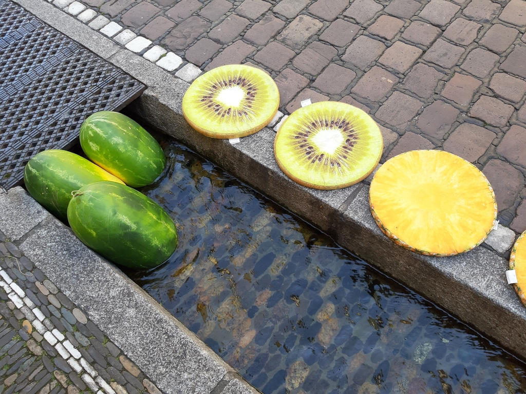 Nordwestlich des Bahnhofs befindet sich unter der Stadtbahnbrücke eine besondere Wasser-Skulptur, die zwei barfuß sich gegenüber liegende Menschen darstellt, genannt ‘Schlucker und Spucker‘, Bächle inklusive. Es ist lustig anzuschauen: Aus dem Boden ragen nur Kopf, Hände und Füße hervor. Man kann wegen der Größe der Skulptur leider nur eine der beiden Figuren auf das Foto bannen. Allerdings habe ich dort noch niemals so viel Müll gesehen wie im verlinkten Artikel erwähnt. Aber kleine Glasscherben sind dort leider immer wieder anzutreffen.