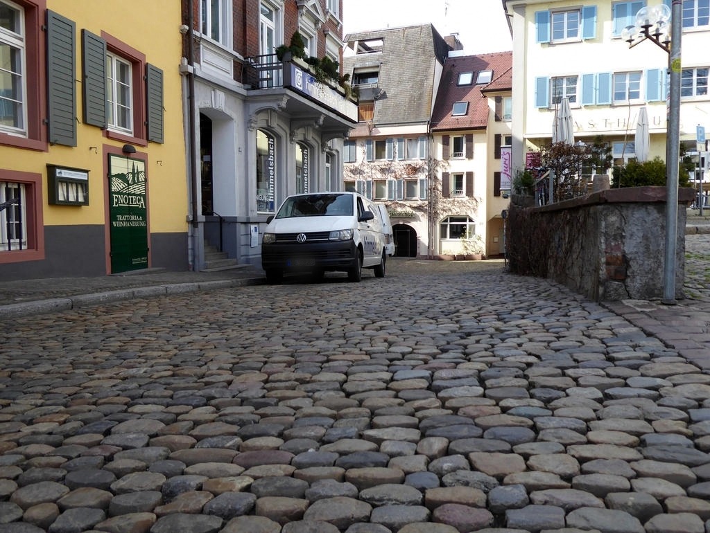 Bislang befand ich Freiburgs Innenstadt für sauber, aber ein Besuch vor vielen Jahren in Trier belehrte mich eines besseren. Hin und wieder sieht man in den Ritzen der Pflaster Scherbchen aus Glas, die aber für die Fußsohlen überhaupt nicht gefährlich sind, da sie sich ja (wie eben erwähnt) in der Tiefe der Ritzen befinden. Ich denke, dass die Kehrmaschinen ebenso wenig wie nackte Sohlen mit diesen sehr tief sitzenden kleinen Scherbchen in Berührung kommen. Eine Ausnahme macht vielleicht der Augustinerplatz, weil da viele junge Leute auf den Stufen sitzen, um zu feiern, wo doch mal das eine oder andere Glas zu Bruch gehen kann.